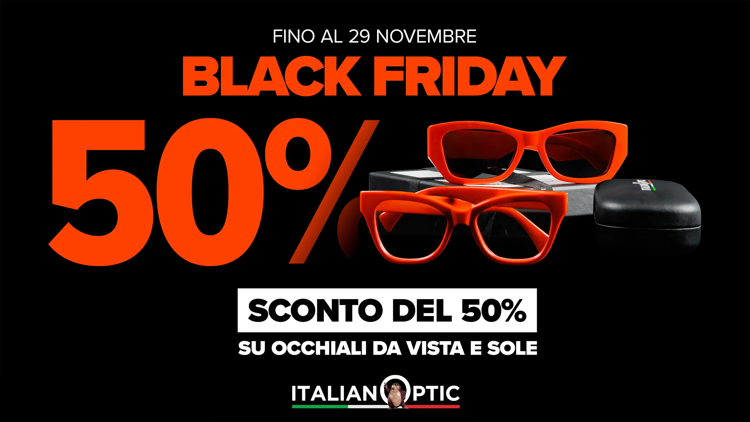 Quest’anno il Black Friday arriva da ItalianOptic con un’occasione imperdibile: scegli i tuoi nuovi occhiali e approfitta del 50% di sconto su lenti + montatura. Modelli di qualità, consulenza professionale e massimo comfort visivo.