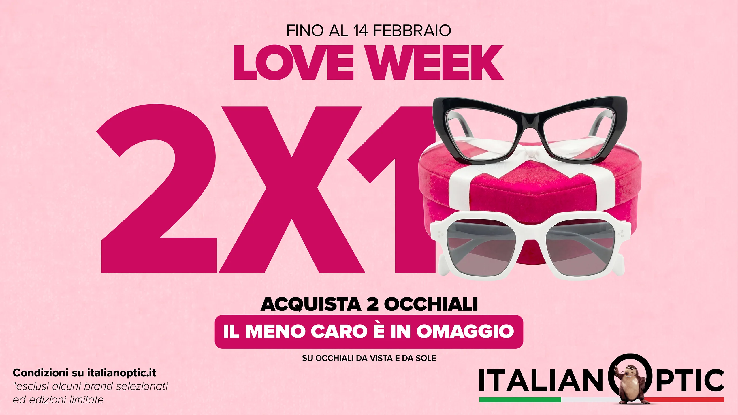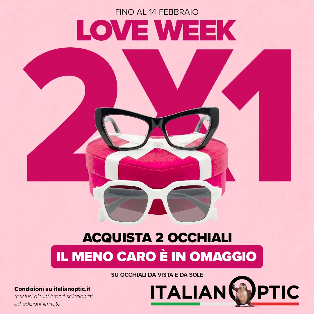 Fino al 14 febbraio approfittate della nostra promozione speciale Love Week: acquistando due occhiali, il meno caro è in regalo. L’offerta è valida su occhiali da vista e occhiali da sole, per adulti e bambini. Scegliete tra le collezioni dei migliori brand: montature leggere in metallo, modelli in acetato dal design deciso e lenti di altissima qualità per ogni esigenza visiva.